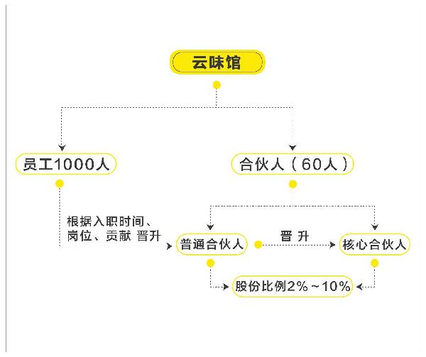 禄鼎记品牌初级阶段的员工激励方式 除了行为引导,物质奖励也必不可少,公司会从每个月的净利润中提取一部分作为企业基金,用来激励员工,让他们更有归属感。 华哥说,喜欢被员工称为“小华”,品牌初期,情感上的共鸣很重要。他认为,一个团队中,管理层并没有比基层店员更重要,少了哪一方都是对品牌的伤害。 云味馆:利润共享的“合伙人”战略云味馆目前 1000 多名员工,公司合伙人就有 60 人之多。 不管你是总监、经理、店长还是服务员,只要符合条件,就能成为合伙人,即使是洗碗大叔也可以。因为有了合伙人制,云味馆就没有设定普通企业的KPI指标,而是靠愿景的内在驱动,来实现企业的战略目标。 之所以会推行“合伙人”战略,源于米线哥推崇的华为全员股权分配制度。米线哥深知,未来的云味馆要做到迅速扩张,需要大量的管理人才储备,不然一切都是空谈。 所以,开始尝试“合伙人制、奖金制、项目制”来激励员工。